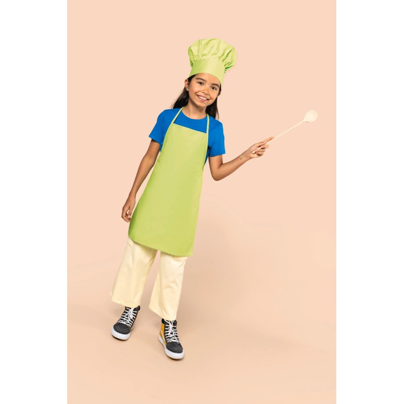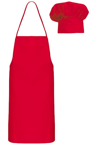 100% coton. Kit composé d'une toque et d'un tablier. Toque de chef réglable à l'aide d'une bande auto-agrippante.