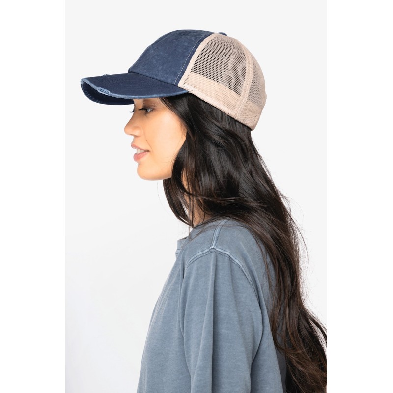 Visière et panneau avant en 100% coton biologique. Panneaux arrières en mesh 100% polyester recyclé post-consumer. Tissu en twill et en mesh. Aspect délavé et usé. Casquette 6 panneaux ajustable. Produit teint en pièce après montage : les couleurs peuvent varier d'un produit l'autre. Ce produit est susceptible de déteindre au contact avec des surfaces ou vêtements clairs.