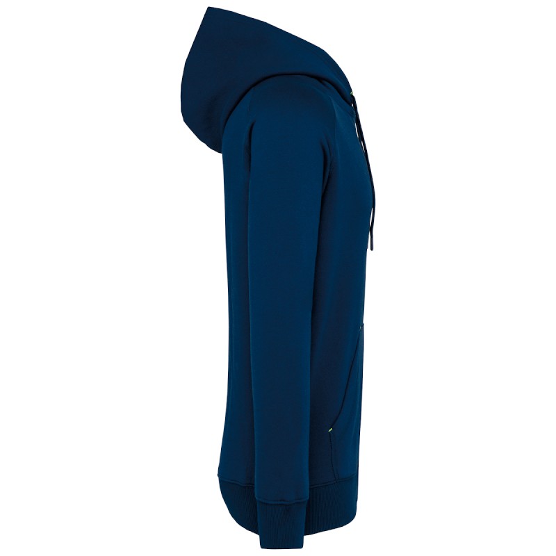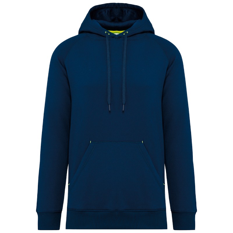 65% polyester /35% coton. Fil Vortex. Molleton gratté. Coton peigné. Coupe ajustée. Manches raglan. Capuche doublée en maille filet ton sur ton. Bande de propreté à l'intérieur de la capuche, œillets du cordon de la capuche et points d'arrêts sur les poches en coloris fluorescent. Poches kangourou avec 1 poche pour téléphone fluorescente. Poignets et bas de vêtement en bord-côte double épaisseur 2x2. Finition demi-lune encolure au dos pour faciliter la personnalisation de marque à l'intérieur. Etiquette de marque Tear-away.