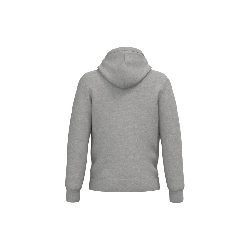 85% coton biologique / 15% polyester recyclé post-consumer. Produit doublé en sherpa écru sur toutes les couleurs : capuche, manches et corps. Coton peigné. Coupe ajustée. Lavé aux enzymes. Molleton non gratté 3 fils LST (Low Shrinkage Terry : molleton pré-rétréci). Bord côte 1 x 1 bas de manches et bas de vêtement. Finition intérieur col avec bande de propreté en chevrons ton sur ton. Double surpiqûre à cheval sur emmanchures, bas de manches et bas de vêtement. Capuche 2 panneaux doublée en sherpa, avec surpiqûre et point d’arrêt cordon. Poche kangourou. Cordon rond avec embouts et œillets en métal recyclé. Zip de personnalisation bas de vêtement. Demi-lune au dos.