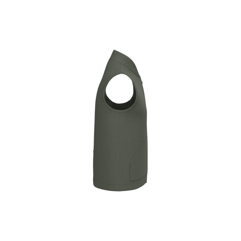100% coton biologique. Rembourrage en polyester recyclé. Coupe droite. Tissu en twill. Veste sans manches rembourrée avec polyester recyclé. Col teddy en bord côte 1 x 1. Poche kangourou. Fermeture devant avec zip en plastique et tirette en métal recyclé ton sur ton. Doublure matelassée ton sur ton. Poche intérieure avec velcro, côté droit au porté. Patch de personnalisation en matière principale avec bride de suspension intérieur de vêtement. Zip de personnalisation poitrine et bas de vêtement.
