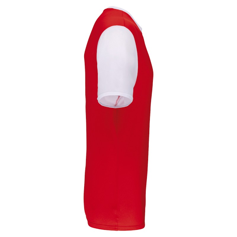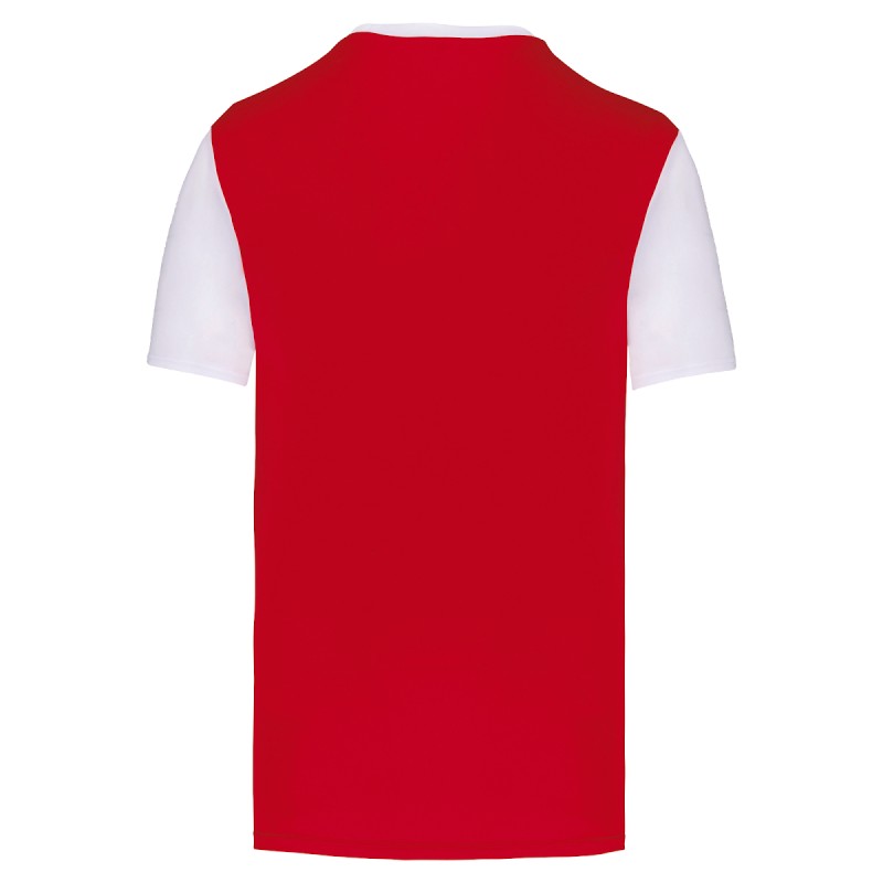 100% polyester. Maille interlock. Coupe droite. Encolure ronde contrastée et bande de propreté. Manches droites contrastées. Finitions double aiguille au bas de manches et de vêtement.