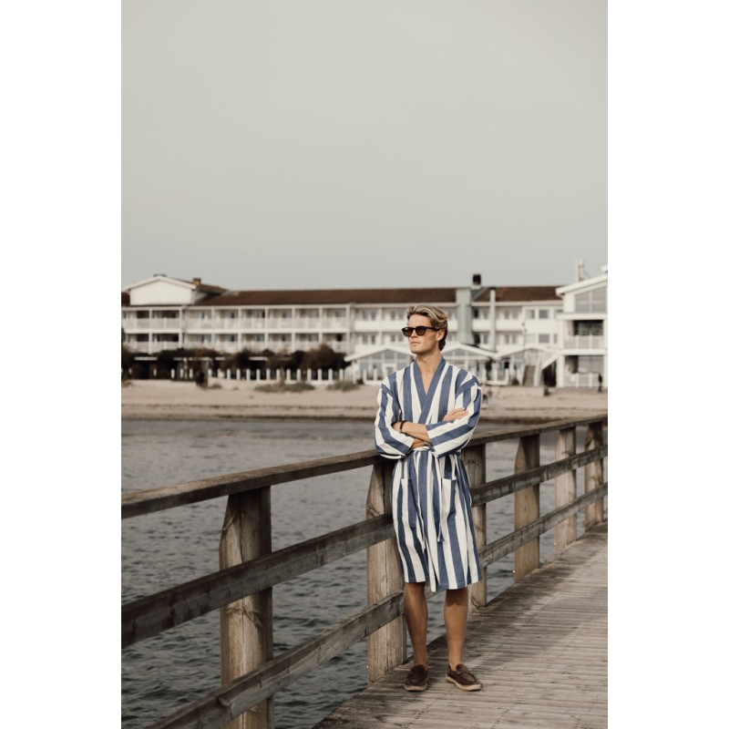 Apportez ce peignoir de hammam doux et confortable à la plage ou profitez-en simplement à la maison. Fabriqué dans un mélange léger et aéré de 200 g/m², il allie le confort du coton aux avantages du séchage rapide du polyester. Conçu dans un style classique avec un motif rayé bicolore, il présente un col soigné, des poches sur le devant, des manches 3/4 et une ceinture à la taille pour un ajustement parfait. Certifié par GRS (Global Recycled Standard), la certification GRS garantit que l'ensemble de la chaîne d'approvisionnement des matériaux recyclés est certifiée. Le contenu recyclé total est basé sur le poids total du produit. Ce produit contient 69 % de coton recyclé certifié GRS et 29 % de polyester recyclé certifié GRS.