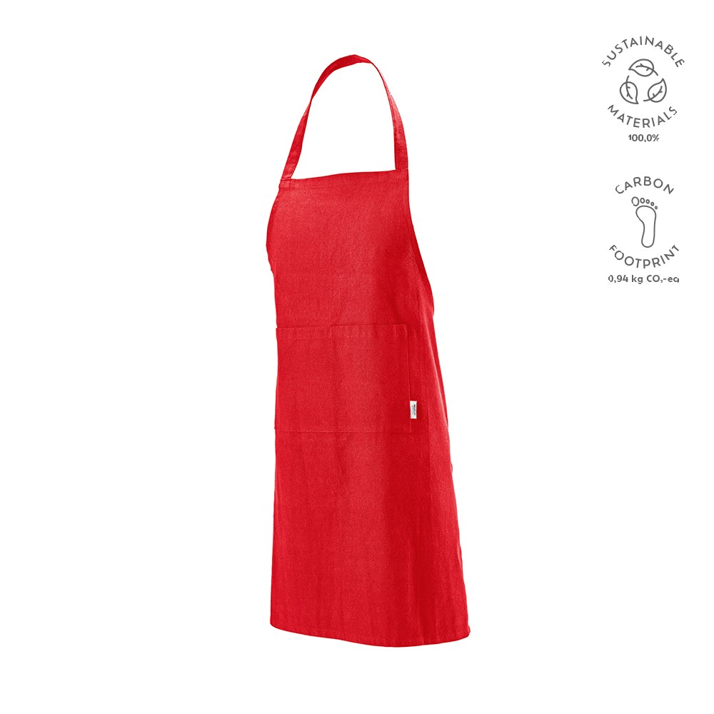 Portez ce tablier confortable et durable en coton recyclé 180 g/m², avec des bretelles et deux poches frontales pratiques pour plus de fonctionnalité. Fourni dans un emballage individuel biodégradable.