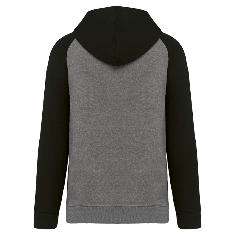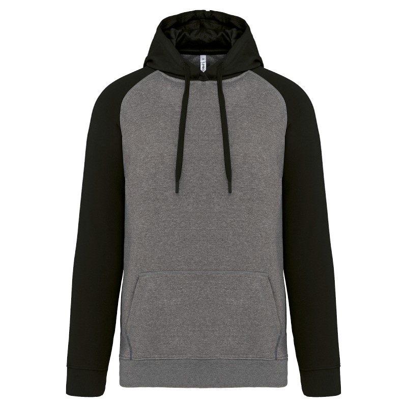 65% polyester / 35% coton. Molleton gratté. Manches raglan et capuche contrastées. Capuche doublée en maille filet ton sur ton. Poches kangourou avec poche téléphone fluorescente. Passe-fil écouteurs. Poignets et bas de vêtement en bord-côte double épaisseur 2 x 2.