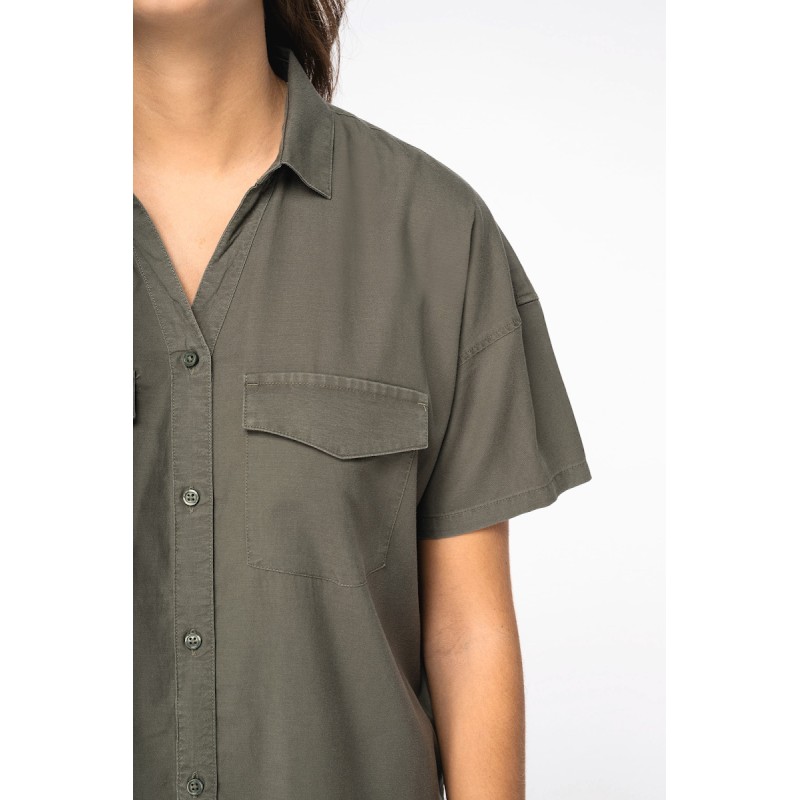 60% Lyocell TENCEL™* / 40% coton biologique. Coupe oversize. Lavé aux enzymes. Boutons en plastique recyclé ton sur ton. Patte de boutonnage rapportée. Chemise décolletée. Deux poches plaquées à rabat sur la poitrine. Empiècement au dos. Dos rallongé. Fentes latérales. Vêtement lavé après montage : les couleurs peuvent légèrement varier d'un produit à un autre. Ce produit est susceptible de déteindre au contact avec des surfaces ou vêtements clairs. *TENCEL™ est une marque de Lenzing AG.