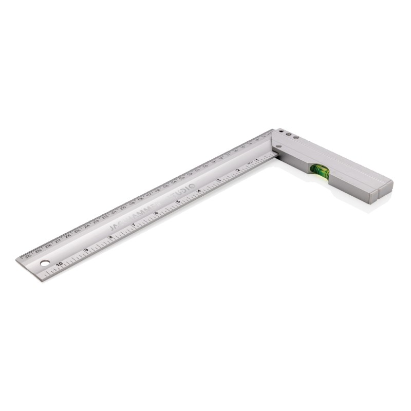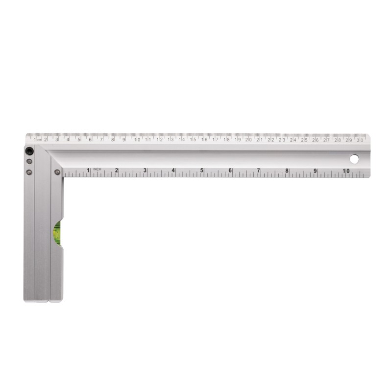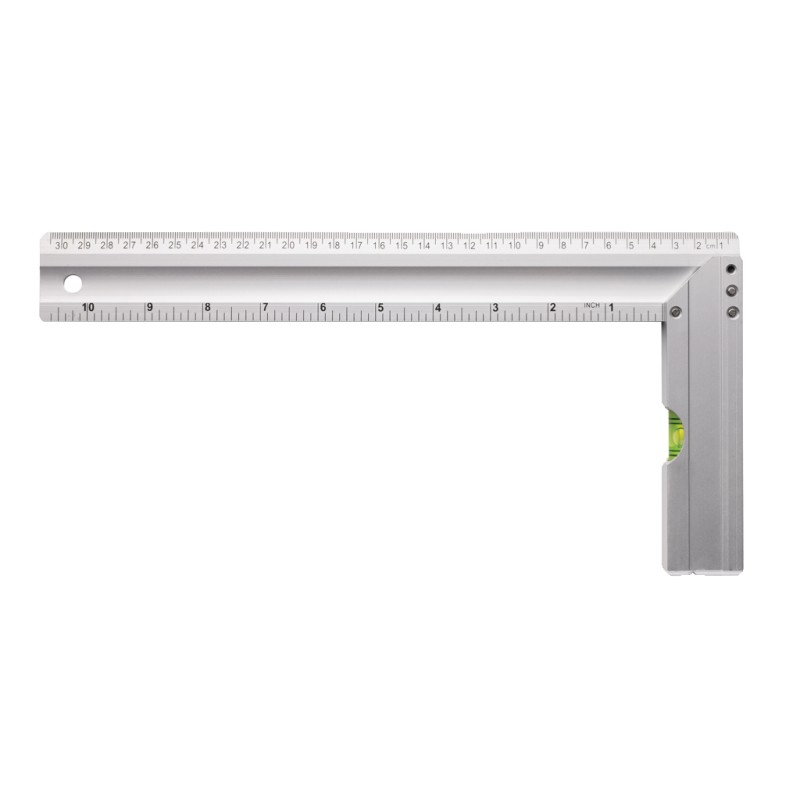 Règle professionnelle en aluminium, carrée, avec niveau intégré pour mesurer les coins et dessiner des carrés. Graduation recto-verso en centimètres (30) et en pouces (10). Précision du niveau 0,5mm.