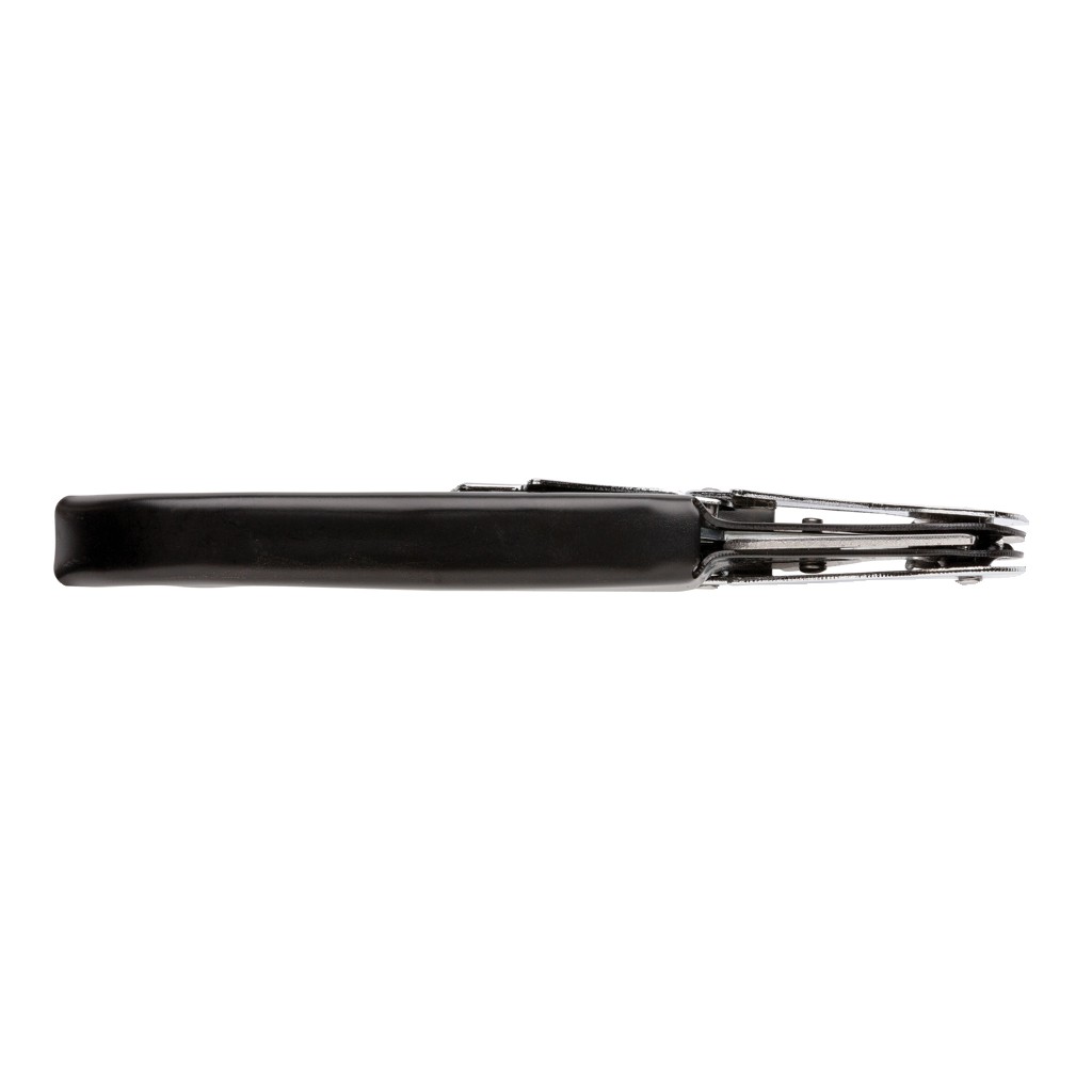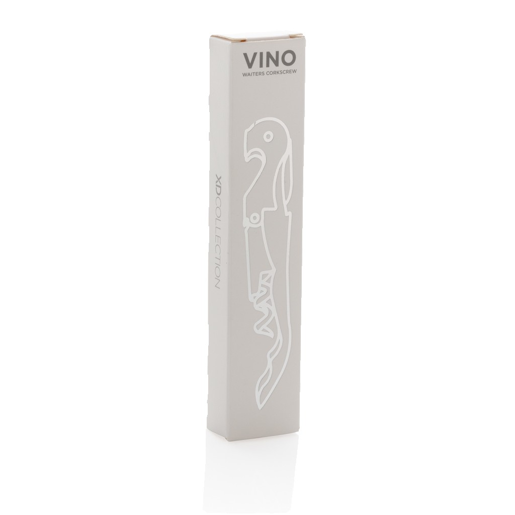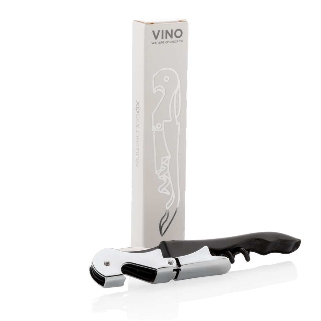 Tire-bouchon de serveur avec une lame de coupe capsule, d'un système d'ouverture à double levier et d´un décapsuleur. Emballé dans une boîte cadeau.