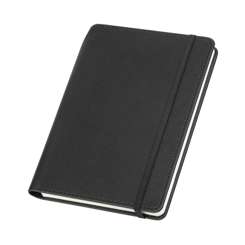 Bloc-notes A5 avec couverture rigide en PU. Ce bloc-notes comporte 192 pages lignées (70 g/m²), fabriquées à partir de matériaux certifiés FSC™ et d'autres matériaux certifiés, un porte-stylo (stylo non inclus) et un élastique. Livré dans un sac non tissé. 140 x 210 mm