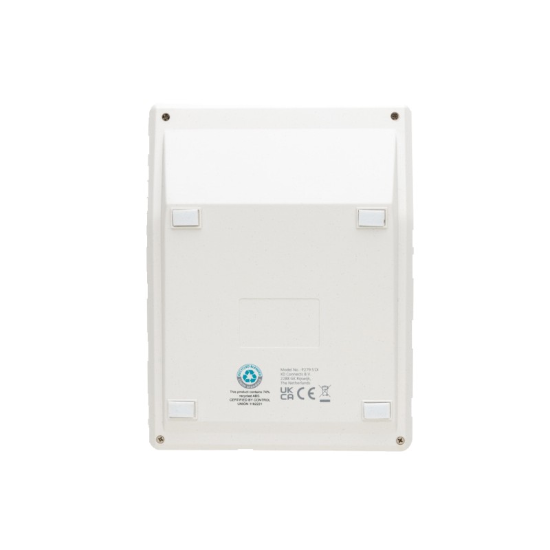 Calculatrice à 8 chiffres fabriquée en ABS recyclé certifié RCS et bambou FSC® 100% . Teneur totale en matières recyclées : 70% selon le poids total de l'article. La certification RCS garantit une chaîne d'approvisionnement entièrement des matériaux reyclées. Fonctionne avec des piles ou via énergie solaire.