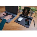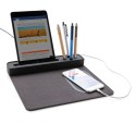 Tapis de souris rectangulaire mince et élégant avec une face arrière antidérapante, livré avec support pour téléphone et 4 supports pour stylos. Mettez rapidement votre smartphone sous tension par câble ou tout autre appareil certifié Qi sans fil en le posant simplement sur le côté droit du tapis de souris. Câble de 1,5 m inclus. Entrée : 5V/1A ; Sortie 5V/1A ; Sortie sans fil : 5V/1A 5W.
