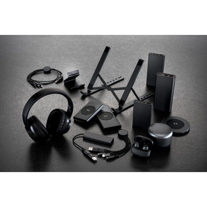 Support pour ordinateur portable ou tablette fabriqué avec de l'aluminium recyclé certifié RCS (Recycled Claim Standard) et du TPU. Contenu recyclé total : 99% sur la base du poids total de l'article. La certification RCS garantit une chaîne d'approvisionnement entièrement certifiée pour les matériaux recyclés. Le support est pliable et peut accueillir tout ordinateur portable jusqu'à 15,6". Le support peut être réglé sur 8 angles différents pour une posture ergonomique optimale lorsque vous travaillez sur votre ordinateur portable. L'aluminium ne perd pas ses caractéristiques dans le processus de recyclage et peut être recyclé à l'infini. Compatible avec la plupart des tablettes et ordinateurs portables courants. Avec des bandes de TPU recyclé certifiées RCS au bas du support pour éviter de glisser. Emballé dans un emballage FSC® mix.