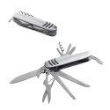 Couteau de poche multifonction en acier inoxydable et métal. Comprend 11 fonctions : tire-bouchon, anneau de couture, lime à ongles, poinçon, tournevis PH, ouvre-bouteille et ouvre-boîte, ciseaux, écailleur de poisson et écarteur d'hameçon, scie à bois et couteau. 90 x 25 x 18 mm