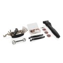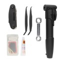 Kit de réparation à vélo dans une pochette 600D. L'ensemble contient 6 rustines en caoutchouc, 1 râpe métallique, 2 tubes de valve en latex, 1 tube de colle, 2 leviers en nylon, 1 clé en aluminium, 1 clé 16-en-1 multi-outils, 1 pompe en nylon. La clé 16-en-1 inclus : une clé hexagonale 2/2,5/3/4/5/6mm chacune, une clé à douille 8mm/9mm/10/mm chacune, un tournevis plat, un tournevis cruciforme, une tige d'extension de prise, une clé plate 8/10/15mm, une clé à rayons 14/GE.