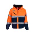 Veste en polyester, fabriquée en tissu rip-stop à carreaux fin, imperméable et respirant. Doublure amovible en laine polaire Sherpa. Bandes rétro-réfléchissantes de 5 cm cousues en double autour du corps et de chaque bras. Deux bandes réfléchissantes sur le haut des épaules. Poche poitrine avec fermeture auto-agrippante étanche. Poches pour stylo et téléphone portable sur le bras gauche. Capuche amovible. Fermeture à glissière double sens. Conforme aux normes EN ISO20471 Catégorie 3.
